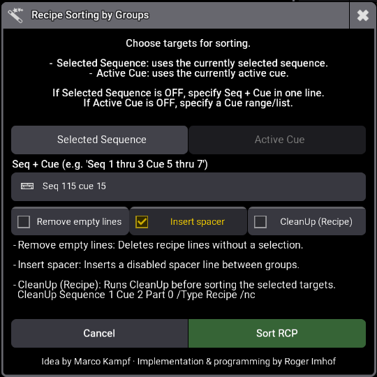 Automatically organize recipe lines by groups within cues or entire sequences.