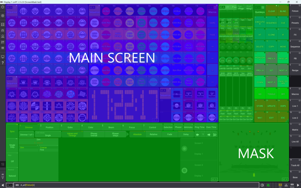 Screen Mask is designed to fill the extra space in onPC with elements that are not necessary on a console in a live situation, but very useful when you work with onPC without additional hardware. For this, Screen Mask let you create a mask view that can be added to a range of views. In this mask view you can at any element, but it will be a good place to have for example Quickeys, Playbacks or a small 3D view.